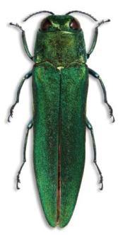The emerald ash borer is an introduced insect pest from Asia that feeds on and kills ash trees.  These insects cut off the flow of water and nutrients within the trees by feeding underneath the bark.  All species and sizes of ash trees (genus: Fraxinus) are susceptible, except for the mountain ash (Sorbus spp.) which is not a true ash.  If a tree has become infested with EAB, mortality will result, usually within 2-3 years.